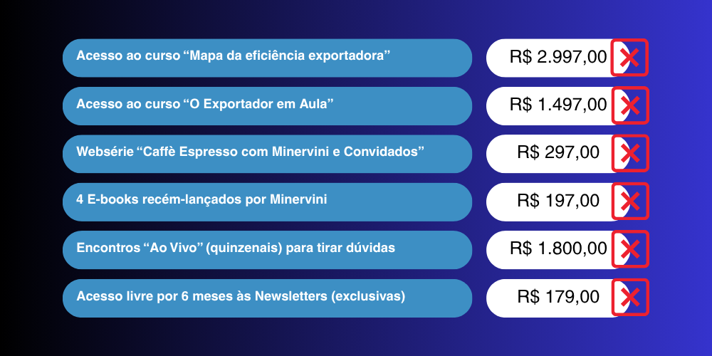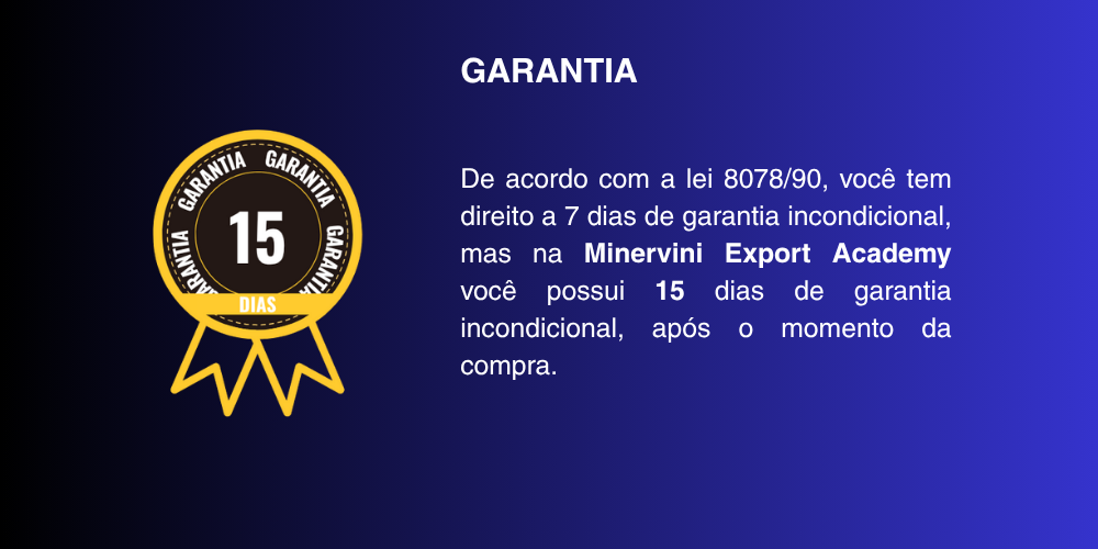 Você também desfrutará de atualizações constantes dos conteúdos da plataforma, garantindo que sempre tenha acesso às novidades mais recentes do Comércio Exterior e possa se diferenciar da concorrência, complementado pelas imersões exclusivas de Minervini.