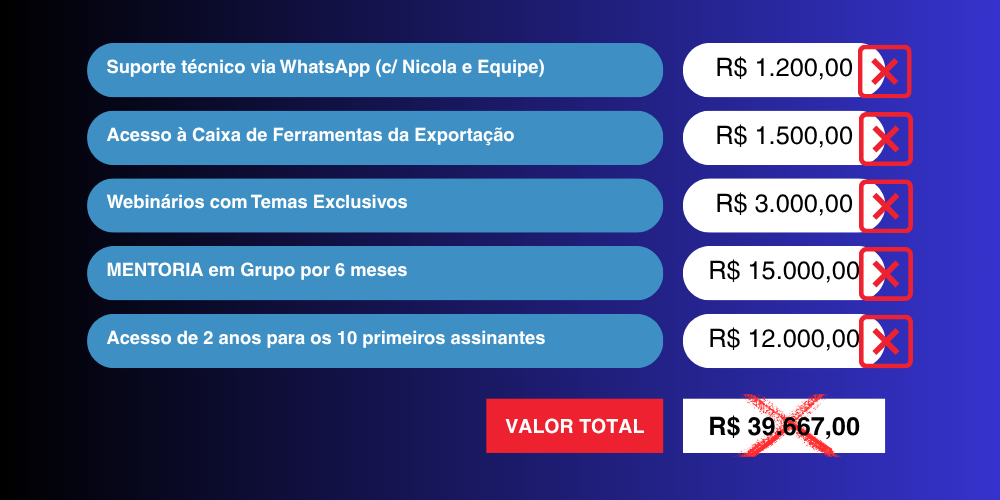 Se você fosse contratar uma consultoria especializada para impulsionar sua carreira e implementar todas essas estratégias na sua empresa, investiria facilmente mais de R$ 50.000,00. Porém, se considerarmos apenas o custo de um erro na exportação por falta de conhecimento, estamos falando de prejuízos que podem chegar a centenas de milhares de reais.